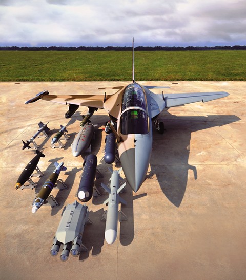 Muestra de la gran variedad de armamento que puede portar el M-346FA, apreciándose también la percha para reabastecimiento de combustible en vuelo.