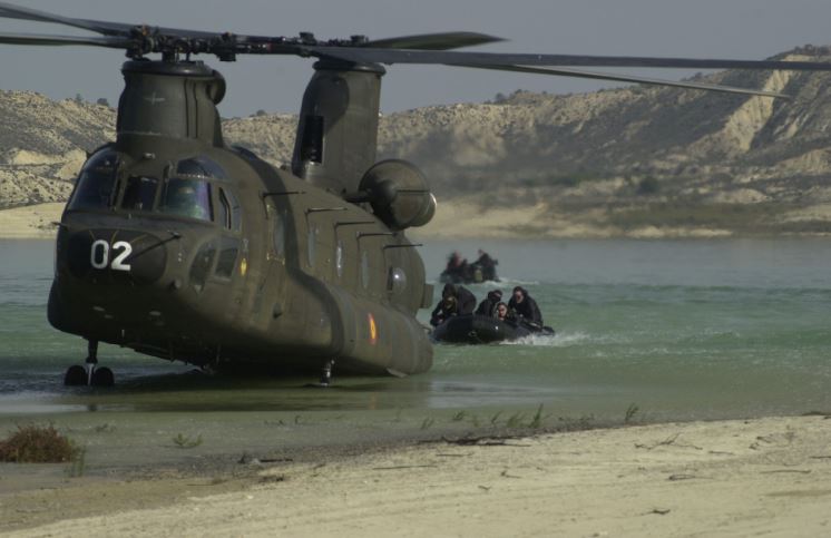 foto: Trabajan regularmente con los helicópteros de las FAMET y para ellos es especialmente útil la capacidad de los CH-47 “Chinook” para desplazar sus equipos operativos y material (foto MOE).