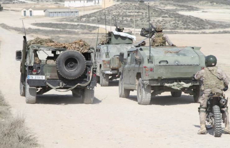 foto: En sus ejercicios es normal ver también a militares de OE de otras unidades españolas. Se puede ver un “Hummer” de la Fuerza de Guerra Naval Especial, junto a los VAMTAC del MOE (foto Octavio Díez Cámara).