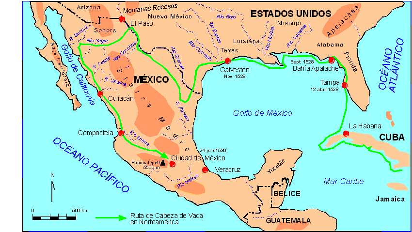 Los aventureros se desplazaban de un poblado a otro, siempre hacia el poniente, meses y meses, durante varios años que duró la travesía. Cruzaron los ríos Brazos y Colorado, así como el río Las Palmas, denominado río Bravo por los mexicanos y río Grande por los estadounidenses, frontera de ambos países. Avistaron las Montañas Rocosas y las enormes manadas de bisontes que pacían en las praderas centrales de Norteamérica. Cabeza de Vaca dice en su obra Naufragios, cap. XVIII: «Alcanzan aquí vacas, y yo las he visto tres veces y comido de ellas…».