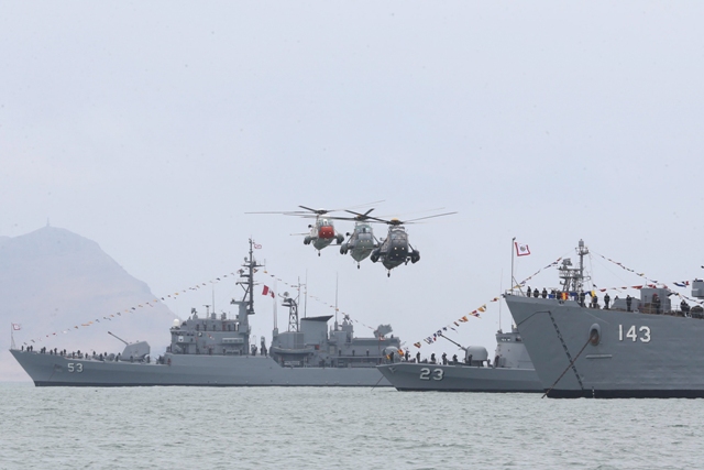 foto: La Fragata BAP Almirante Grau (FM-53), la Corbeta BAP De los Heros (CM-23) y el Buque de Desembarco BAP Callao (DT-143) sobrevolados por los UH-3H y SH-3D Sea King