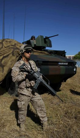 Foto: Un infante de Marina protegiendo un puesto de mando que se forma con varios “Piraña IIIC”. Atrás se aprecia uno (foto del autor).