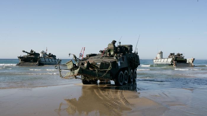 Foto: Uno de los vehículos de exploración desembarcando desde una lancha LCM-1E de la Armada (foto TEAR).