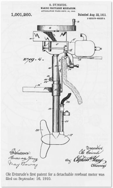 Invento del noruego Ole Evinrude, como consecuencia de una vivencia algo molesta(4), resulta tan conocido que no creemos preciso insistir sobre él. Sin duda es la propulsión que revolucionó el mundo de las pequeñas lanchas y embarcaciones. La patente se presentó el 16 de septiembre de 1910, concediéndose el 22 de agosto de 1911. A pesar que en origen fuese un motor de uso eminentemente civil, lo cierto es que sus utilizaciones militares han ido cada vez a más.