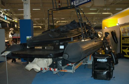 Foto: Lancha “Nautiraid” de comandos, con piragua aneja, propulsada por “hidrojet” Hamilton (foto Camil Busquets).
