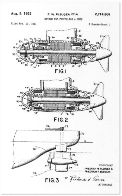 Foto: Documento original de patente del primer sistema de “pod” azimutal, que fue presentado en 1955, obra de Friedrich W. Pleuger y Friedrich F. Busmann (colección Camil Busquets).