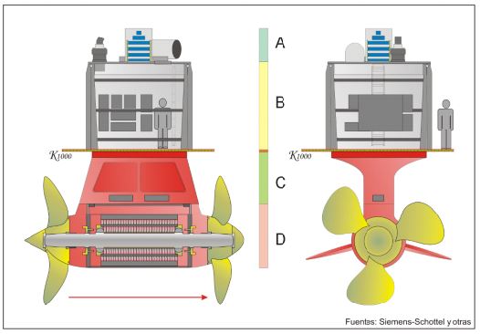 La planta propulsora del Juan Carlos I la forman los dos pods SSP, todo un conjunto de elementos transformadores y convertidores, y los grupos de generación de energía eléctrica. Se trata de dos Siemens-Schottel con una potencia unitaria de 11 Mw, con velocidad de giro de 176 rpm. Los motores son del tipo PM(20), de imanes permanentes y sin escobillas(21). Cada pod está provisto de dos hélices que giran a la misma mano, al estar acopladas al mismo eje. En el esquema adjunto mostramos una idea aproximada de su interior, que se ha subdividido en cuatro partes para mayor claridad. Las A y B quedan en el interior del casco del buque, las C y D en el exterior. La estrecha franja entre las B y C representa el casco. La flecha roja debajo del dibujo izquierdo indica la dirección de la marcha en avante. Los cables de alimentación/ transmisión de energía eléctrica no se han representado, pero van desde la parte A al propio motor. La figura humana proporciona una idea de las medidas de uno de estos pods.