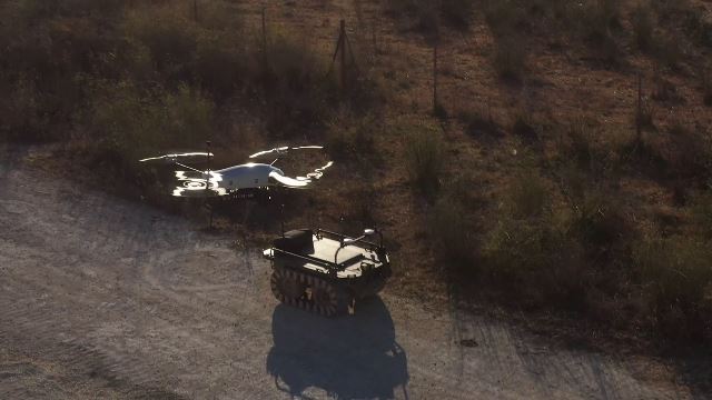 Colaboración entre sistemas no tripulados: El mini UAV “Thor” y el UGV “Probot” (foto Elbit Systems).