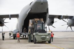 La ministra de Defensa, Margarita Robles, ha asistido ayer domingo en la Base Aérea de Torrejón a la carga de uno de los dos aviones A400M del Ala 31 del Ejército del Aire que trasladarán 20.000 kilos de equipos de protección individual y material sanitario con destino a Ucrania.