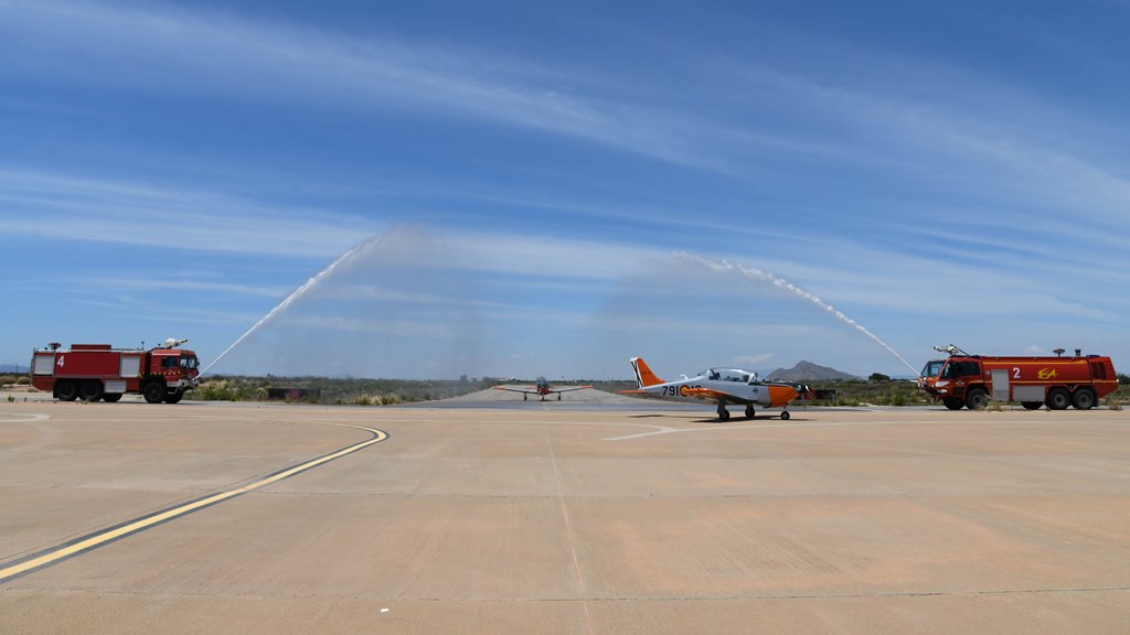 La E-26 Tamiz ha aterrizado en la Base Aérea de San Javier por última vez como aeronave de enseñanza, recibiendo a su llegada a la línea de parking el merecido y tradicional arco de agua, en señal de agradecimiento por sus 36 años de servicio prestados a la enseñanza elemental en la Academia General de Aire y del Espacio. (Fuente y fotos: Ejército del Aire y del Espacio)