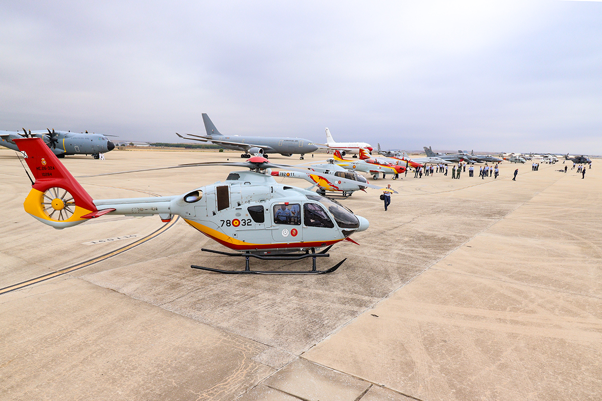 Esa representativa flota de aeronaves llegó desde múltiples bases aérea de España, desde la de Morón (Sevilla) a la de Son San Juan (Mallorca), pasando por la de Zaragoza, que han desplegado sus aeronaves en la parada aérea con el apoyo de la Unidad de base de Torrejón, que lidera el general Alfonso Reyes Leis.