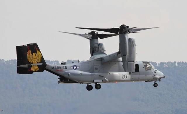 Fotografía: El MV-22B “Osprey” del comandante del VMM 162 en fase final de aterrizaje en la base de Torrejón. (foto Julio Maíz)