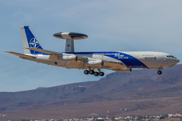Las unidades de cazan están apoyadas por un Boeing E-3A Sentry de la OTAN, un AWACS (Airborne Early Warning and Control System), que llegaba el pasado viernes procedente de su base de Geilenkirchen (Alemania). El aparato desplazado es el que lleva la decoración especial aplicada este mismo año para recordar el 70º aniversario de la creación de la Alianza Atlántica.