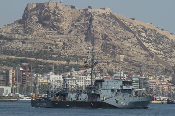 (defensa.com) El 28 de agosto llegaba al puerto de la ciudad de Alicante el Standing NATO Mine Countermeasures Group/Grupo Permanente de Medidas Contra Minas de la OTAN 2 (SNMCMG2). La flotilla está compuesta por cuatro unidades, como buque insignia figura el navío de patrulla oceánica italiano “Aviere” F-583, siendo los otros tres componentes los cazaminas: “Homburg” M-1069 de la clase Frankenthal (Alemania), “Europa” M-62 (Grecia) de la clase británica “Hunt” y que anterior sirvió en la Royal Navy británica como HMS “Bicester”; y el “Erdek” M-263 (Turquía) de la clase “Edincik”, transferido por Francia donde sirvió como “Cybele” M-712 .
