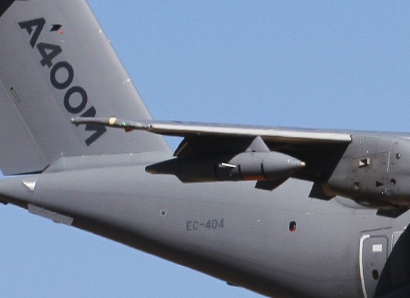 ·Detalle de uno de los dos “pods” subalares Cobham 905E, que lleva instalados el A400M (Julio Maíz).