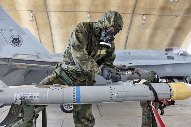 ·Armeros del Ala 12 con equipos protectores ante elementos NBQR instalan misiles en uno de sus EF-18M. Foto: Ejército del Aire.