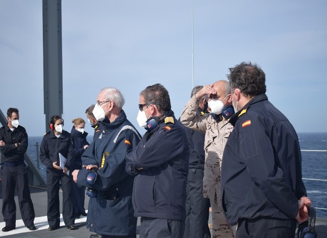 Finalizada la visita al OHQ el Almirante López Calderón, junto con el Almirante de la Flota y el Comandante del OHQ, se trasladó al buque “Juan Carlos I” donde asistió a una presentación de sus capacidades y estado actuales y al desarrollo de diferentes ejercicios aeronavales en aguas del golfo de Cádiz.