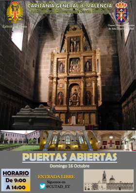 Tras el éxito de afluencia de público, con 9.000 visitas en un fin de semana en la jornada de puertas abiertas del pasado mes de mayo, el Cuartel General Terrestre de Alta Disponibilidad (CGTAD), antigua Capitanía General de Valencia, vuelve a abrirse el domingo día 16 de octubre al público general, con acceso totalmente libre. La antigua Capitanía General de Valencia, sede del Cuartel General Terrestre de Alta Disponibilidad (CGTAD), ha organizado una Jornada de Puertas Abiertas el domingo día 16 de octubre para todo aquel que desee contemplar este antiguo Real Convento de Santo Domingo en horario de mañana de 9:00 a 14:00 horas.