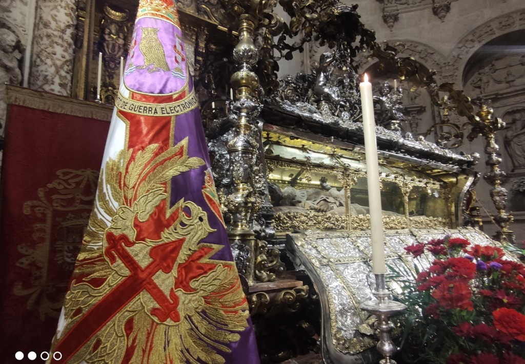 Guion del Regimiento de Guerra Electrónica número nº 32, en segunda termino se puede ver la urna que contiene el impresionante cuerpo de Fernando III “El Santo”. (foto Julio Maíz)