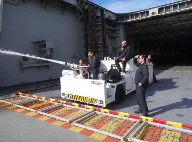 Innovadora ha sido la adaptación de uno de los medios específicos con que cuenta el buque como es el vehículo contra incendios VRAC diseñado por la firma EINSA para actuar en caso de accidentes de vuelo, que ha sido adaptado para la desinfección de grandes superficies como son el hangar o el dique inundable. En su depósito se han incluido agentes químicos que son dispersados con gran eficacia en estos grandes espacios.