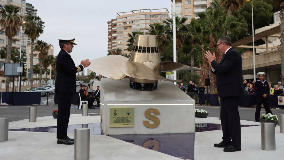 Ceremonia de inauguración del monumento de la hélice “Cazadora”, a la derecha el alcalde Pérez, y a la izquierda el almirante Torres. (foto Ayuntamiento Benidorm)