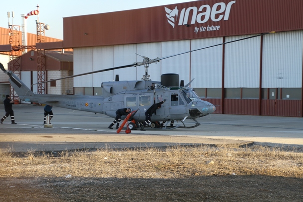 Fotografía: Imagen del helicóptero AB-212 matriculado 09-309, que es prototipo de la modernización, en la planta de Inaer de Albacete, destaca exteriormente que vuelve a llevar el radomo, que utilizaban cuando realizaban tareas antisubmarinas, aunque ahora alojan un nuevo radar de vigilancia marítima.