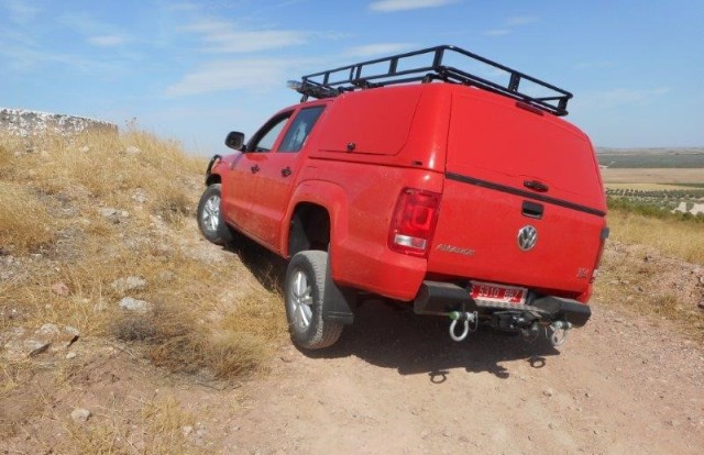 Entre estos están el hard top que cierra la zona de carga del pick-up y que incluye puertas laterales batientes en lugar de los habituales cristales. Sobre el techo de este y el de la cabina cerrada para cinco plazas vemos sendas bacas para el transporte de equipos y un pórtico de luces de tipo LED. En la zona de carga se ha instalado un cofre estanco con una segunda batería y también se ha procedido a la instalación de un cabrestante frontal para poder recuperar el vehículo en caso de que quede atascado o para rescatar a su vez a otros vehículos. Sobre la aleta delantera derecha se ha incluido un snorkel que sube por el pilar A para permitir que el motor tome aire a mayor altura de la habitual, en caso de vadeo.