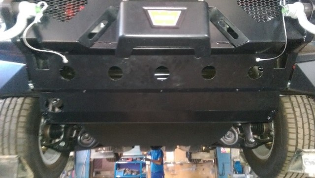 En la parte delantera y trasera se han montado paragolpes metálicos de diseño específico mucho más resistentes que los originales del vehículo. Estos incluyen los ganchos de remolque específicos delanteros y traseros que cumplen la normativa OTAN y en la zona frontal además del cabrestante se aprecian una defensa específica y una protección para los bajos delanteros.