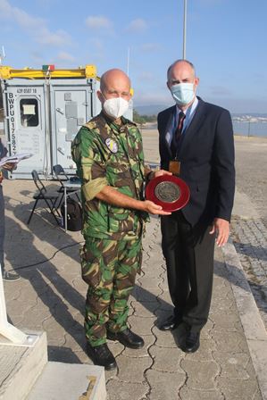 El Director de la Autoridad Portuaria de Ceuta César López Ansorena entrega una metopa conmemorativa al jefe de operaciones de REP MUS 21, comandante Paulo Simões (Javier Bárcenas)