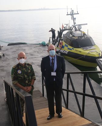 El Director de la Autoridad Portuaria de Ceuta y el comandante Paulo Simões, jefe de operaciones de REP MUS 21 con el Vendaval al fondo (Javier Bárcernas)