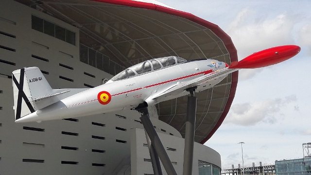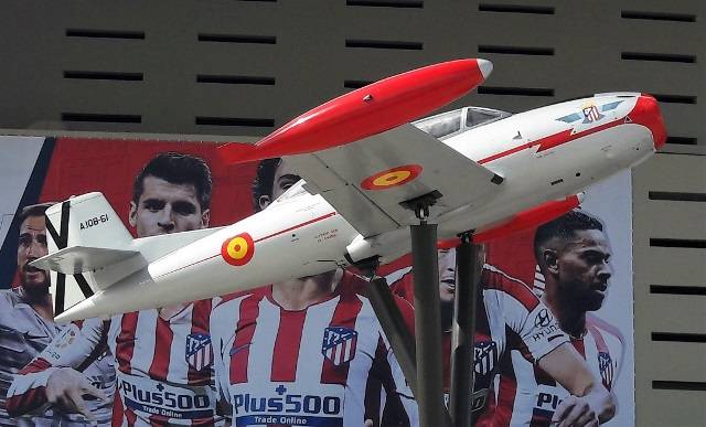 Desde la semana pasada en las inmediaciones del coliseo del Atlético de Madrid, el Wanda Metropolitano, está instalada una antigua aeronave Hispano Aviación HA-200D Saeta, un homenaje a la época en la que el club fue el Atlético-Aviación. Situado en la intersección entre el lateral este y el fondo norte del estadio, al noreste de Madrid, porta la matrícula militar A.10B-61 y el esquema plateado pintado en la primera época en la que sirvió en el Ejército del Aire.