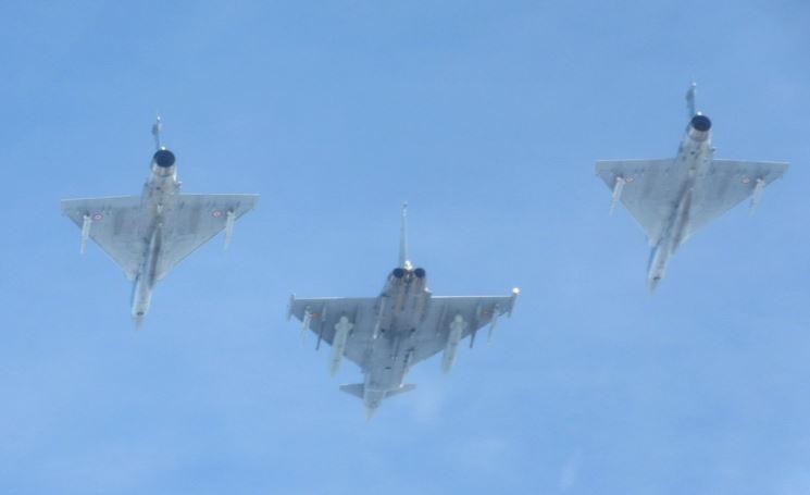 -El Eurofighter del Ala 11 encabeza la formación que completan dos Mirage 2000-5F. Foto: EMAD.