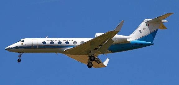 (defensa.com) Con motivo de la visita del presidente de México, Enrique Peña Nieto, han llegado al aeropuerto Adolfo Suarez Madrid-Barajas dos interesantes aeronaves militares mejicanas. Así, a última hora de la mañana del domingo 8 de junio aterrizaba en el aeródromo madrileño el Gufstream Aerospace G-IV-G (G-450), que lleva pintada desde principios de esta década la matrícula civil XC-LMF y que anteriormente lucía la militar AMT-205, de la Secretaría de la Marina de México, aunque está adscrito al Estado Mayor Presidencial y que realiza habitualmente tareas de avión VIP.