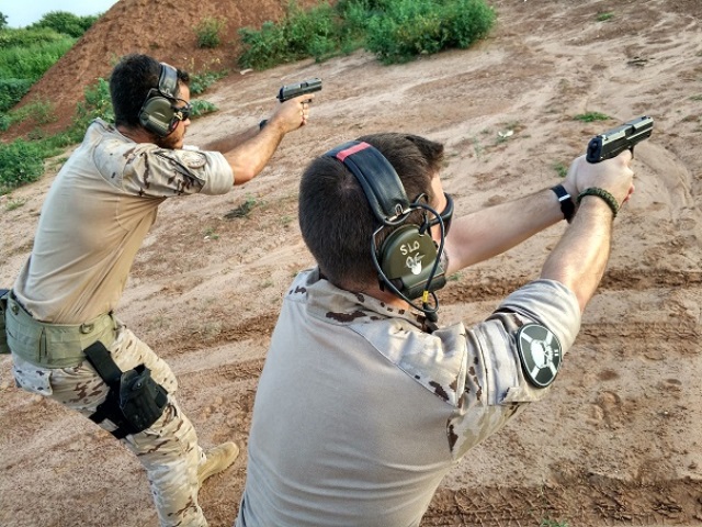 ·En primer plano un tripulante de la Escuadrilla SOF, en la manga derecha lleva el parche de la calavera, durante una práctica de tiro con pistola junto a un miembro de la EZAPAC. Foto: Julio Maíz/defensa.com.