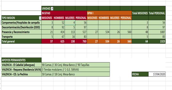 En el cómputo global, las unidades militares del ET en la CA Valencia, han realizado 266 misiones (64 el CGTAD y 197 otras unidades del ET).