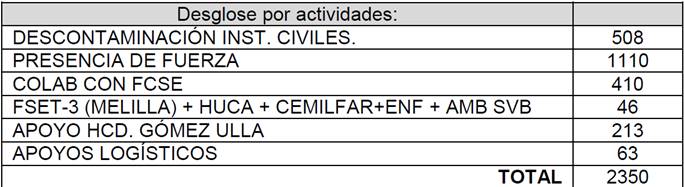 El número de efectivos militares del MCT participando en la operación Balmis en toda España es el que figura en la tabla adjunta (dato del 16 de abril. Este dato varía cada día pero se mantiene en alrededor de 2.500).