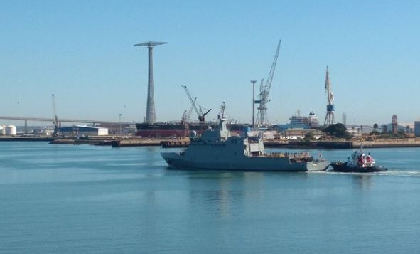 El nuevo BAM durante la maniobra de salida del puerto. Foto: Navantia.