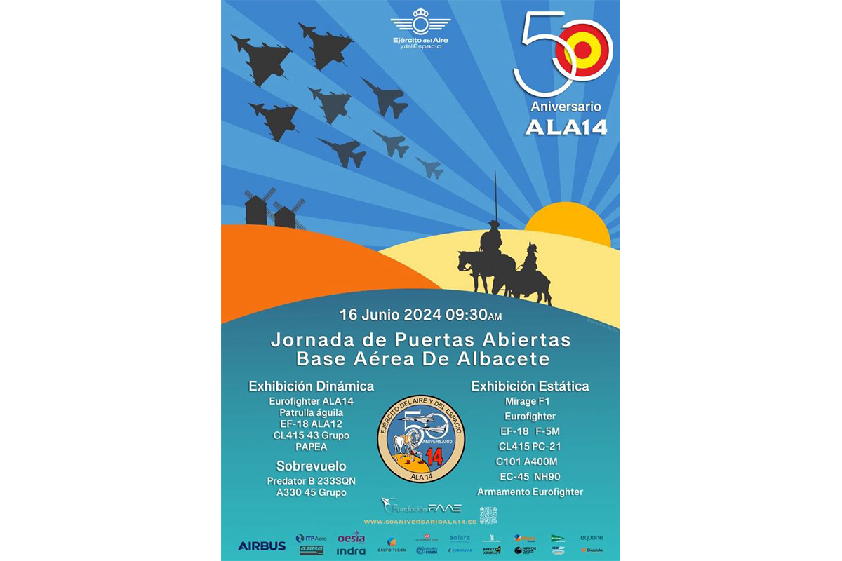 El Ala 14 del Ejército del Aire y del Espacio celebrará el próximo 16 de junio su 50º aniversario en su sede, la Base Aérea de Albacete, mediante una exhibición con sus aviones de combate Eurofighter y otros muchos medios en el marco de una interesante jornada de puertas abiertas.