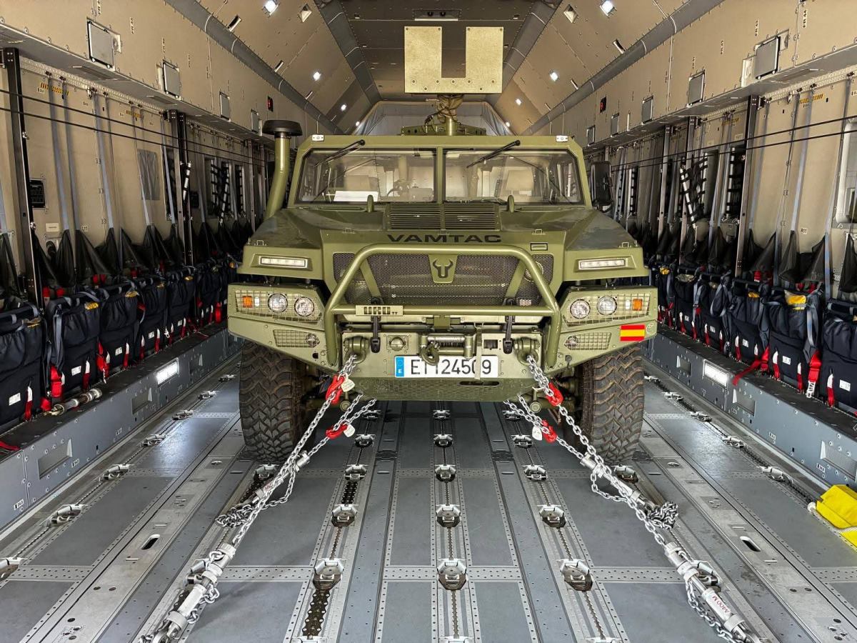 Imagen del VAMTAC ST5 ya trincado en la bodega del A400M. (foto FUTER)