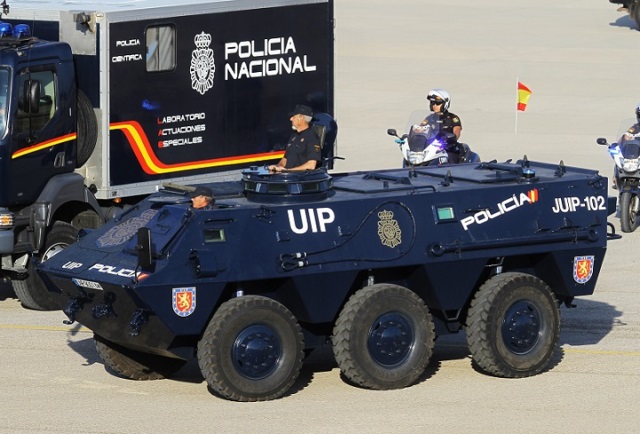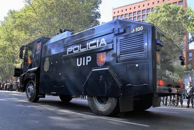 Respecto al referido medio lanza agua y antidisturbios, basado en un camión Iveco Trakker 410, nunca ha sido usado por CNP. Este vehículo, al que también denominan popularmente el “botijo”, fue diseñado específicamente para labores antidisturbios, y según la adjudicación realizada en 2014 costó 348.480 euros, que se pagaron a las empresas Beit Alpha Technologies de Israel y la española Quatripole Ingeniería. En la referida base del Trakker 410, que propulsa un motor turbodiésel de 13 litros y 410 CV, se monta un sistema de lanzamiento de agua y una pala empujadora delantera para retirar barricadas, además está parcialmente blindado. Su principal misión es dispersar a los violentos con su sistema de pulverización de agua que lanza chorros a 16 bares de presión, hasta una distancia de 150 metros, se alimenta de su gran depósito de 7.000 litros, sito en la parte de la caja. También cuenta con un depósito adicional para llevar gas lacrimógeno o pimienta, o colorante para añadir al agua y así poder reconocer luego a los manifestantes participantes. (Julio Maíz Sanz).