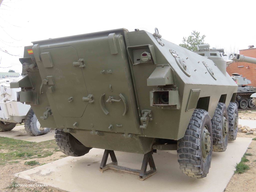 Se trata del prototipo V-001 del BMR, el que sirvió para comprobar lo acertado del diseño y valorar sus prestaciones. Por lo que hemos sabido, ese blindado 6x6 de ruedas, que en su configuración inicial era sustancialmente más grande -ancho y alto- que los BMR que se produjeron para el Ejército de Tierra y otros países, nació especialmente voluminoso y no podía movérsele por tren en las bateas estandarizadas, amén de incluir detalles, como los propulsores hidrojet para moverse en el agua, que lo hacían especialmente caro de adquirir.