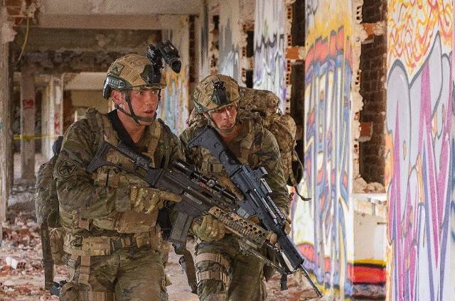 Fotografía: Fuerzas de la Bandera de Infantería Protegida "Roger de Lauria" II/4 de la BRIPAC durante una preparación en combate en zonas CQB. (foto: Ejército de Tierra).