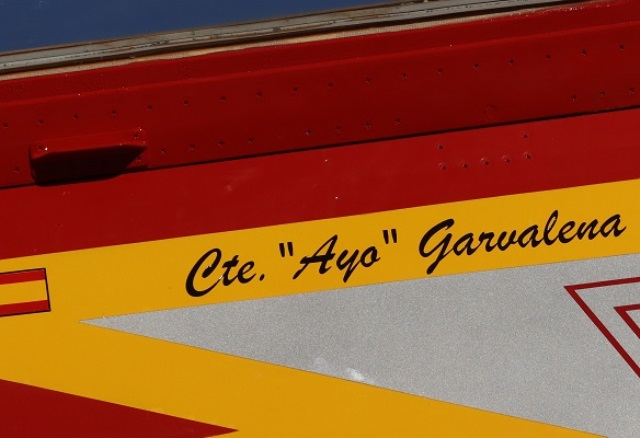 La presencia de la aeronave resalta en buena parte por los vistosos colores de la Patrulla “Águila”, pero lo realmente interesante, aunque a simple vista es muy difícil apreciar, es que en su fuselaje, justo debajo del cockpit figura un pequeño rotulo, que reza: Cte. “Ayo” Garvalena, miembro de la Patrulla “Águila” que perdió su vida en el curso de un misión de vuelo al caer su CASA (hoy Airbus Defence & Space) C-101 al Mediterráneo, frente a las costas de Murcia), el 27 de febrero de 2020.