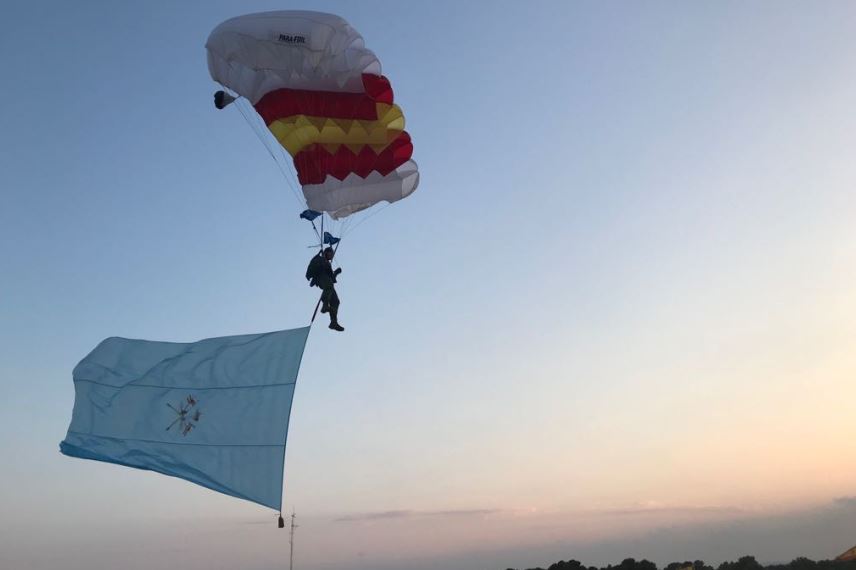 Llegada de la bandera con la insignia de la Caballería, trasladada por un paracaidista. Foto: FUTER.