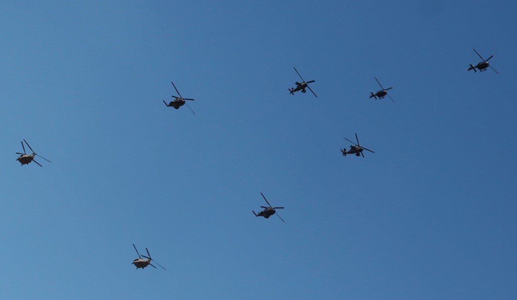 Formación aérea de la Aviación de Ejército de Tierra, cerrada con dos de los nuevos CH-47F. (Julio Maíz)