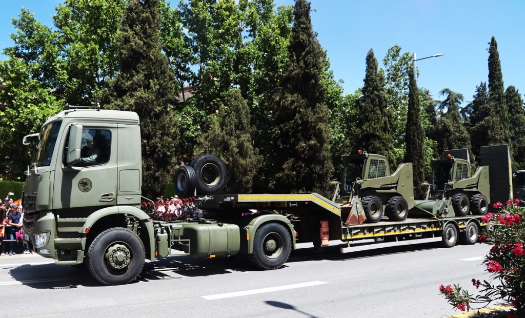 Respecto al desfile terrestre destacar, como novedad, a los Mercedes-Benz Arocs del Ejército del Aire y del Espacio, en concreto asignadas a su Segundo Escuadrón de Apoyo al Despliegue Aéreo (SEADA). Esta Unidad, con sede en la base aérea de Morón (Sevilla), es fundamental para las operaciones de proyección de las unidades de la institución, ha presentado en público a dos cabezas tractoras (arrastrando sendas plataformas que llevaba maquinaria) de estos camiones de la prestigiosa firma alemana.
