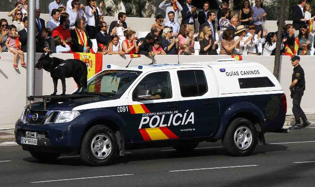 Además de la Guardia Civil fue muy aplaudido el paso de los vehículos del Cuerpo Nacional de Policía (CNP), siendo especialmente llamativo el vehículo de la Unidad Especial de Guías Caninos (UEGC), que portaba en una plataforma encima del capó a uno de sus perros.