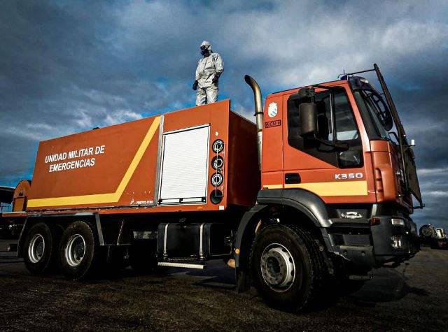 Confundidos en alguna ocasión con camiones de bomberos por su llamativo color rojo, hemos podido ver los camiones como el Renault Trucks C520 que analizamos con motivo de su presencia en la feria FICUR en 2018 equipados para este tipo de tareas, portando equipos de desinfección a gran escala, surtiendo de material a otras unidades a pie o transportando mediante contenedores todo tipo de equipos empleados durante esta operación que todavía continúa.