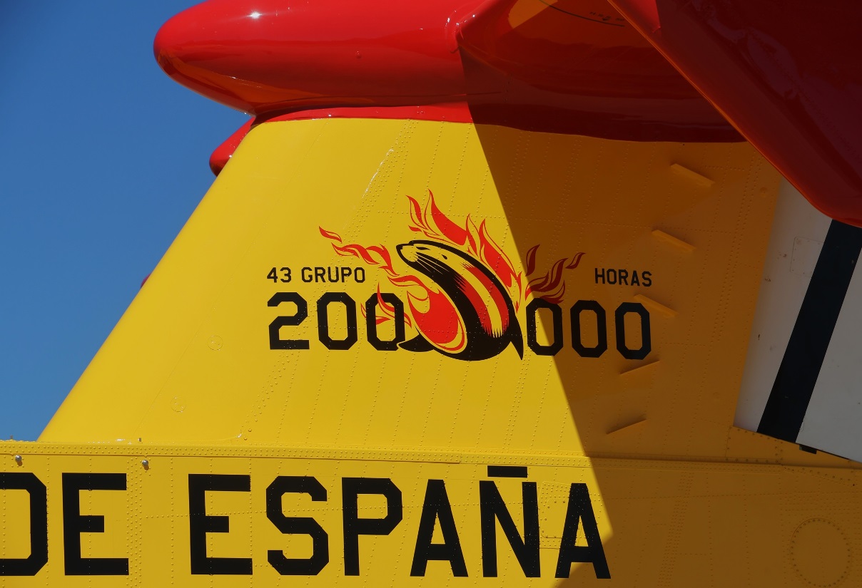El pasado 5 de septiembre se recibía en la Base Aérea de Torrejón (Madrid), sede del 43 Grupo, el avión CL-215T matriculado UD.13-20 tras ser sometido a una gran revisión por parte del MAESAL (Maestranza Aérea de Albacete) con la serigrafía conmemorativa de las 200.000 horas, cambiando el punto por la imagen de una simbólica foca. Esta discreta rotulación, en el fuselaje, bajo los estabilizadores horizontales, simboliza no solo las horas que ha completado una flota, sino los años de trabajo de una unidad que con apenas 150 personas sostiene la operatividad de la flota total de 14 aviones (10 CL-215T y 4 CL-415 o UD-13 y UD-14 según designación militar española) que conforman el 43 Grupo Fuerzas Aéreas.