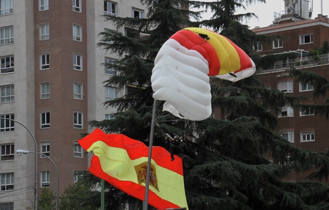 A las 11 de la mañana, comenzaba el minuciosamente preparado desfile del Día de la Fiesta Nacional, tras la llegada de los Reyes a la madrileña Plaza de Lima. Tras pasar revista Felipe VI al Batallón de Honores de la Guardia Real y el saludo protocolario a las autoridades, los actos debían de comenzar con la llegada de la bandera de España, que venía del cielo de la mano de dos profesionales de la Brigada “Almogávares” VI de Paracaidista (BRIPAC). Pero tras llegar el paracaidista de escolta al suelo con precisión, tras saltar desde un C-212 Aviocar a unos 1.500 metros de escolta, el cabo 1º Luis Fernando Pozo que descendía detrás portando la bandera, tras casi llegar al punto de toma, la campana de su paracaídas quedaba enganchado en una farola, afortunadamente sin consecuencias.